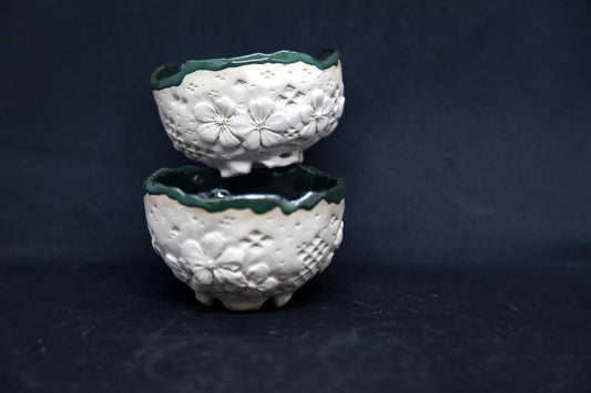 Tasses vertes métalisées sur terre blanche ivoire - motifs de fleurs