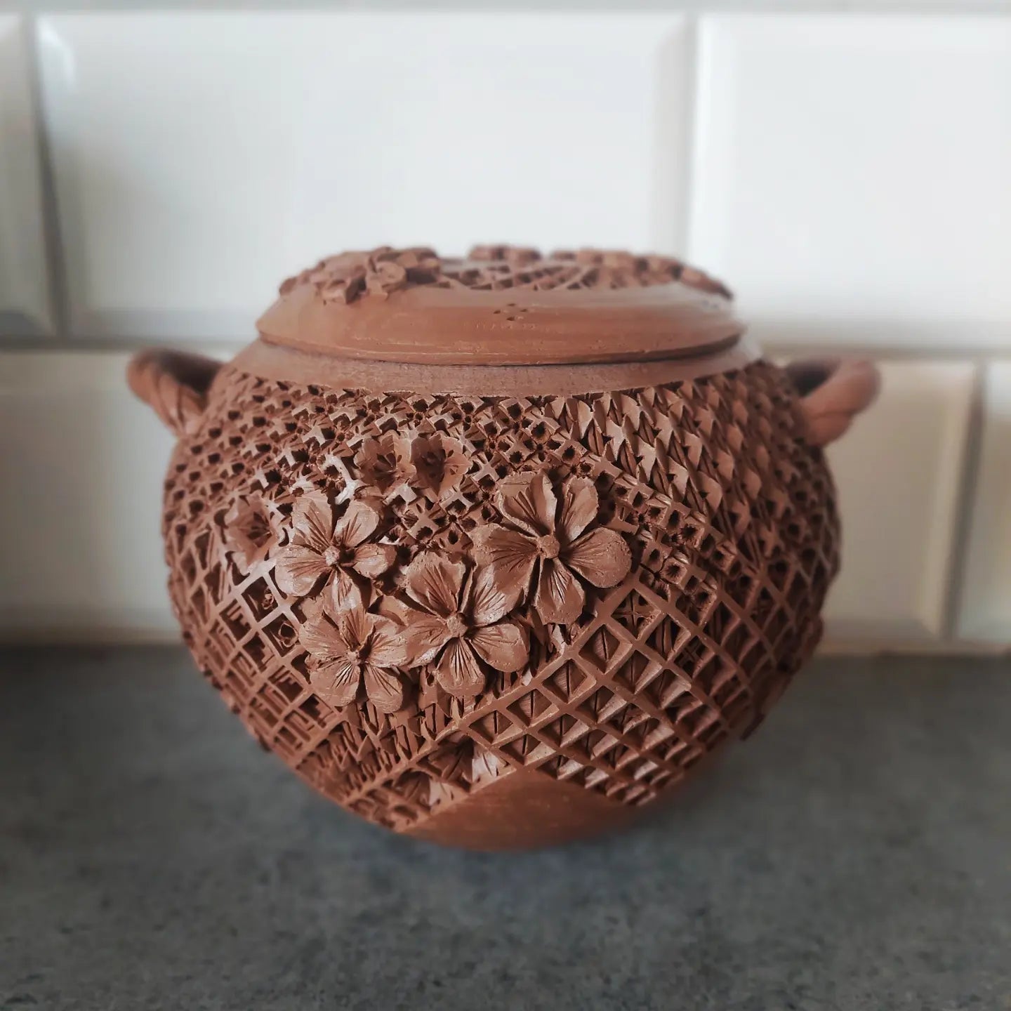 Un certain nombre de pièces ont été sacrifiées pour des essais de motifs, de techniques, de profondeur et de réponse à la pression des outils. Seules les plus jolies demeurent et sont cuites en résonance avec l'intention initiale.