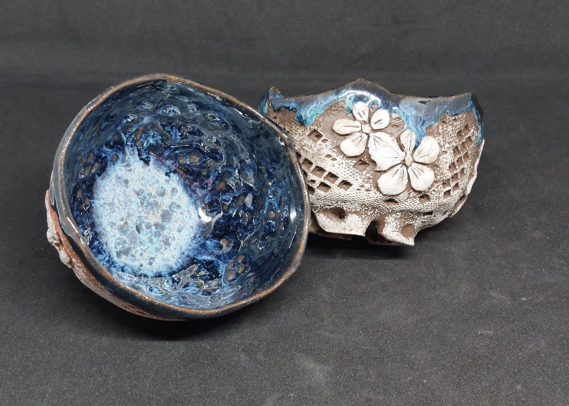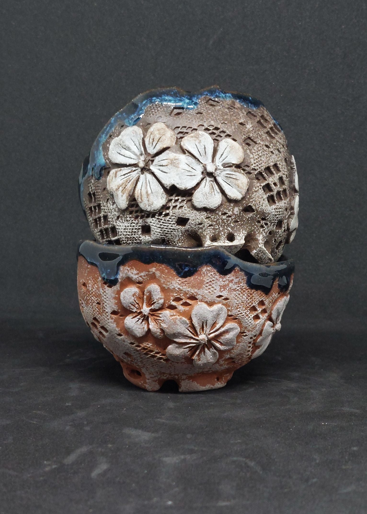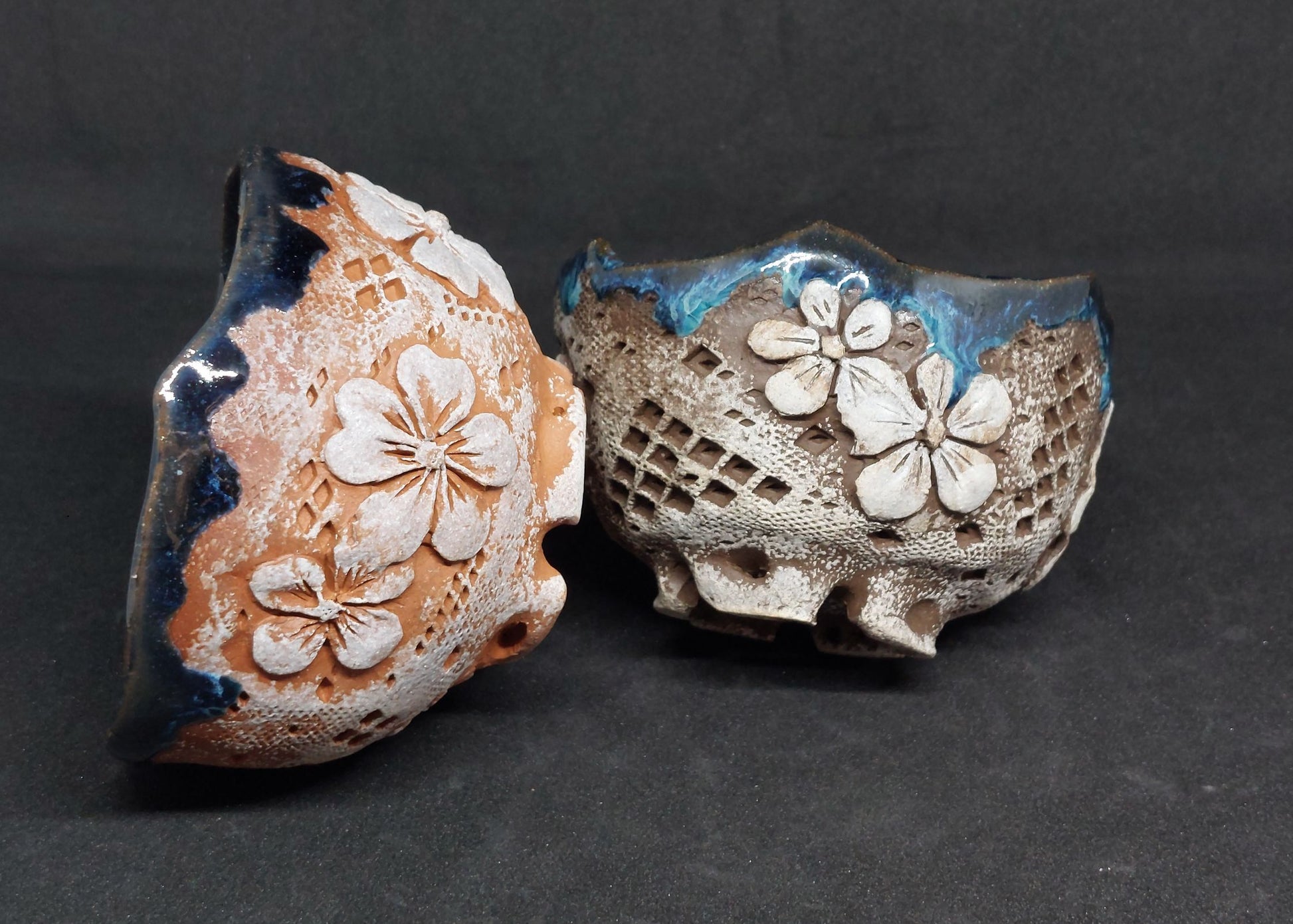 Ces tasses sont pincées et modelées à la main. Leurs formes en demeurent irrégulières et leurs bordures se jouent des normes, amplifiant leur nature brute et naturelle. Les fleurs sont réalisées à main levée, chacune est unique pour éclore délicatement à la surface de la tasse. Enfin, des formes plus géométriques apparaissent et contrastent avec les rondeurs des fleurs et de leurs boutons.