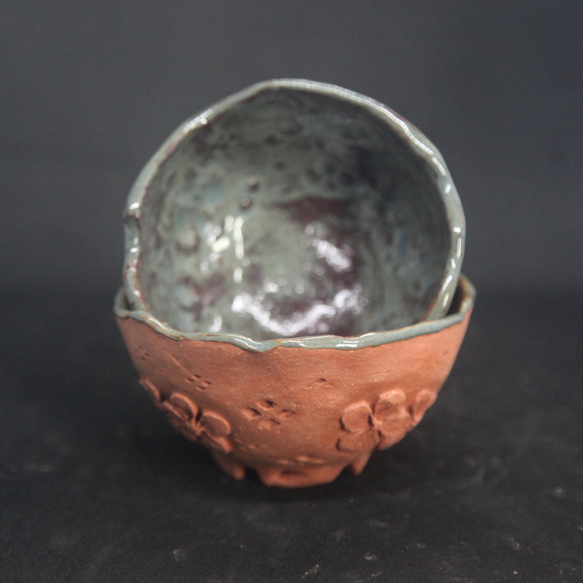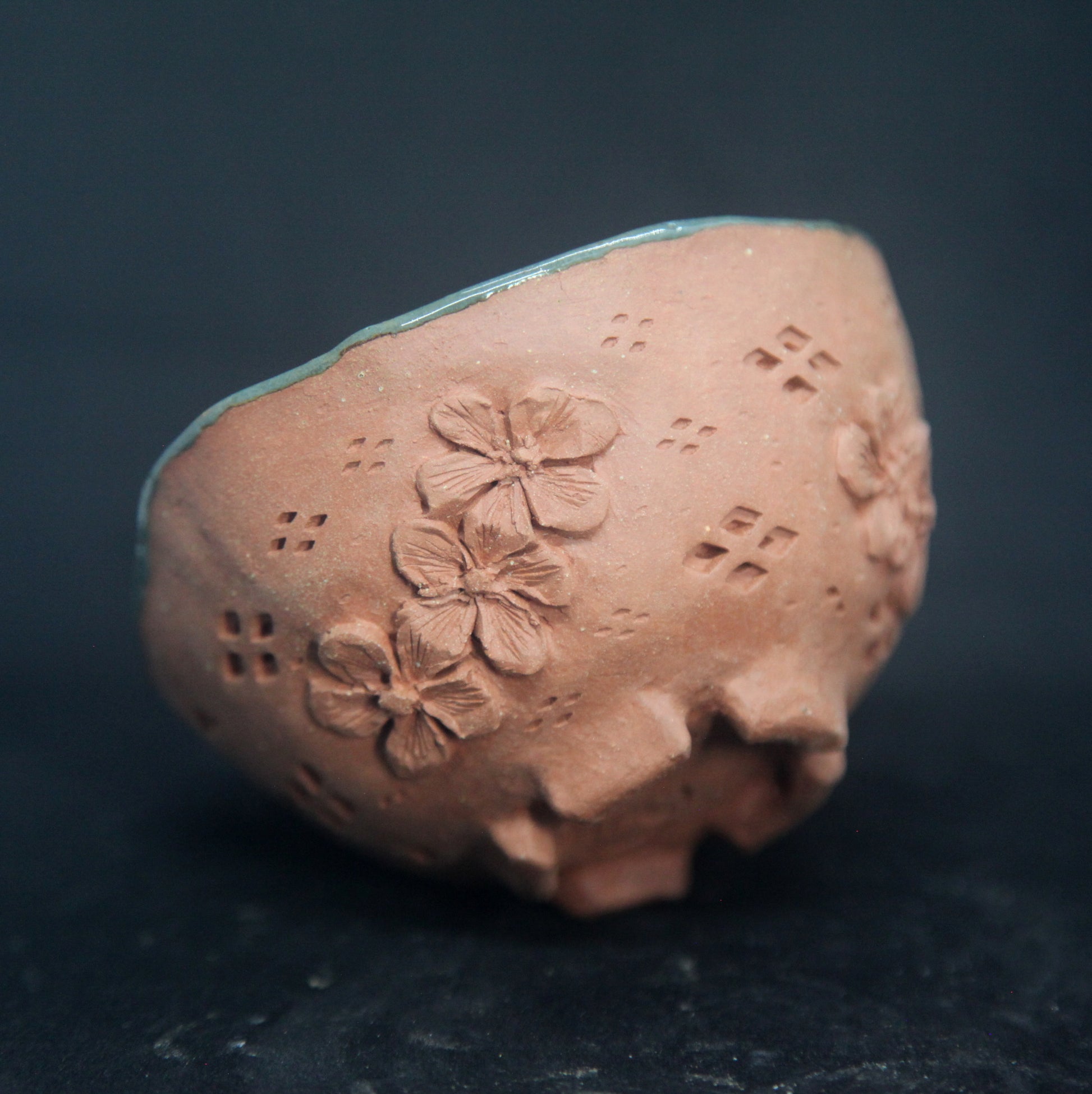 Tasses vert foncé sur terre rouge - motifs de fleurs