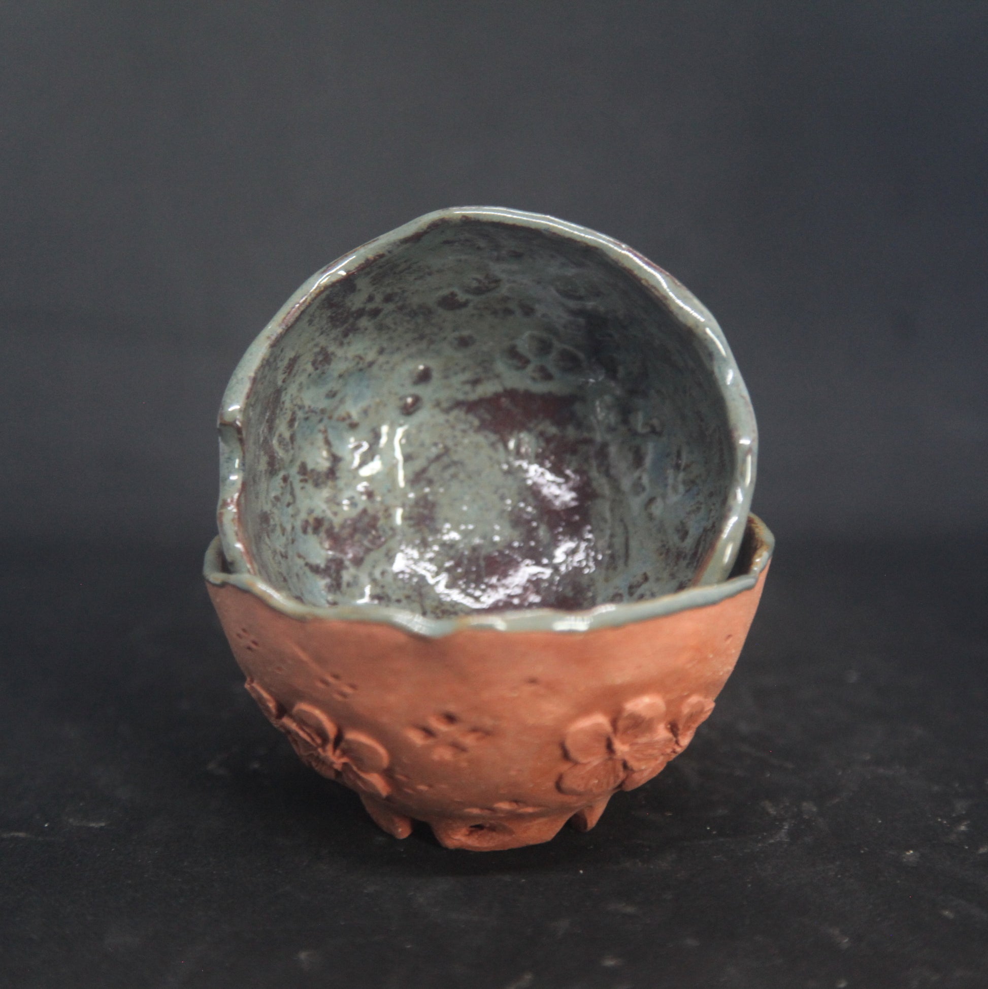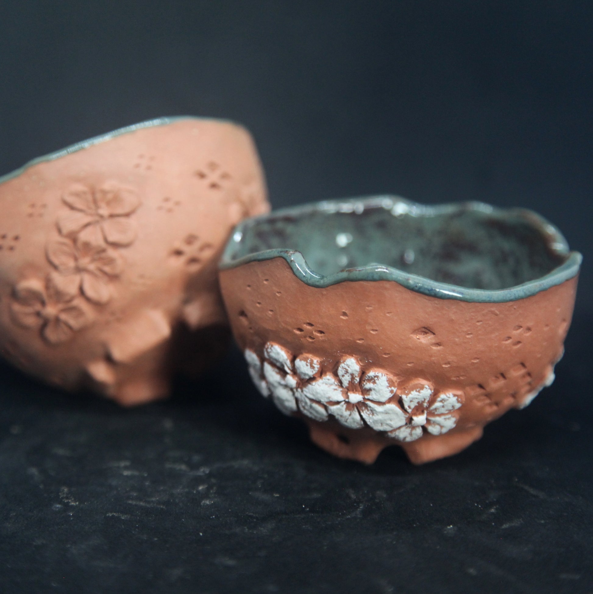 Ces tasses sont pincées et modelées à la main. Leurs formes en demeurent irrégulières et leurs bordures se jouent des normes, amplifiant leur nature brute et naturelle. Les fleurs sont réalisées à main levée, chacune est unique pour éclore délicatement à la surface de la tasse. Enfin, des formes plus géométriques apparaissent et contrastent avec les rondeurs des fleurs et de leurs boutons.